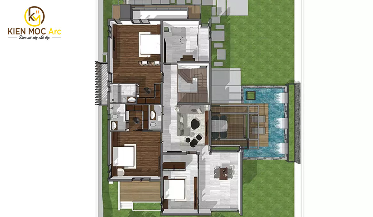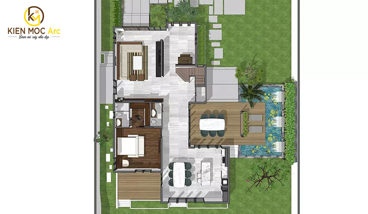 Mặt bằng tầng 1: Mặt bằng tổng thể được phủ xanh toàn tập để tạo nên một không gian tươi mới và thoáng mát. Ngay một bên cửa chính là không gian thư giãn, “chill” với bạn bè và gia đình ngay cạnh bể cá. Bước vào trong sẽ đến không gian phòng khách rộng lớn. Cạnh bên là một phòng ngủ nhỏ kết hợp với phòng vệ sinh và phòng làm việc ngay bên trọng. Đi về cuối là phòng bếp với phòng ăn khá rộng rãi.