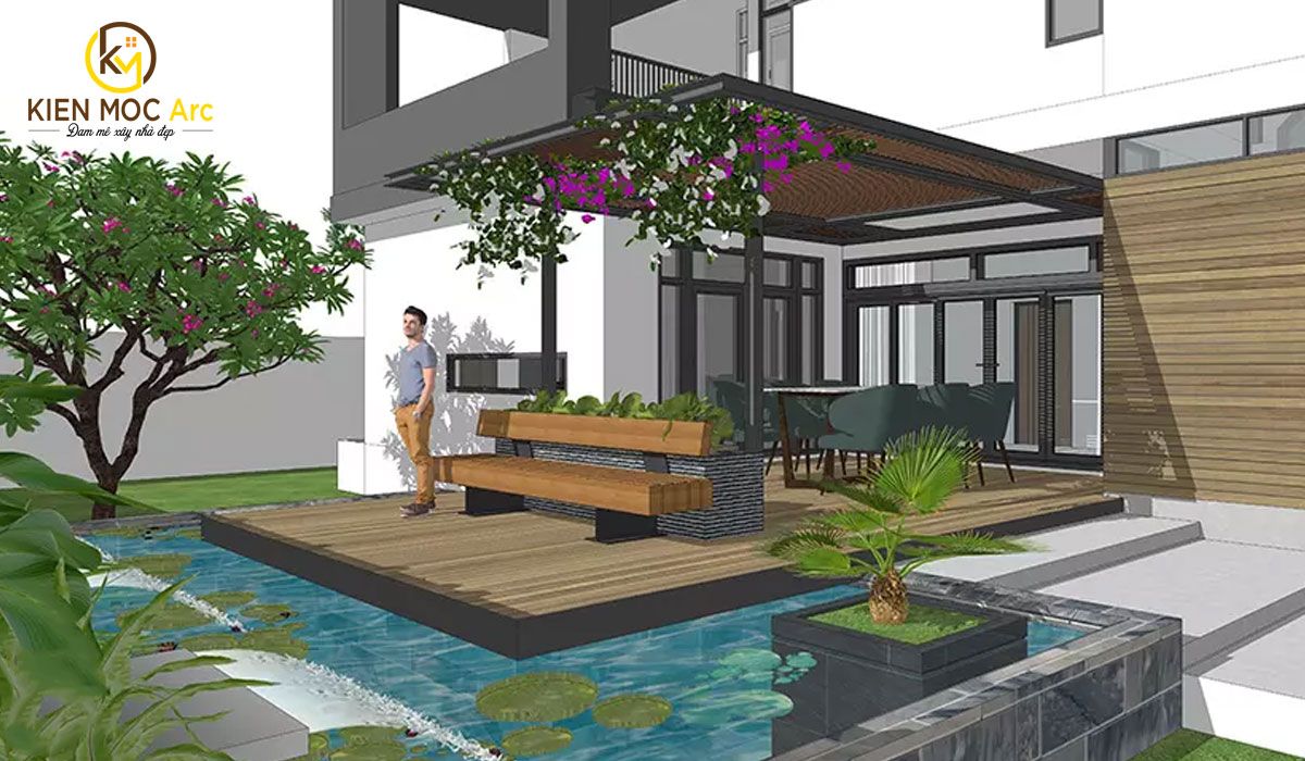 Góc bên ngoài biệt thự được thiết kế như một không gian khu sinh thái với bể cá, cây cối, hoa lá cành, khu vực nghỉ ngơi và thư giãn rất lãng mạn.