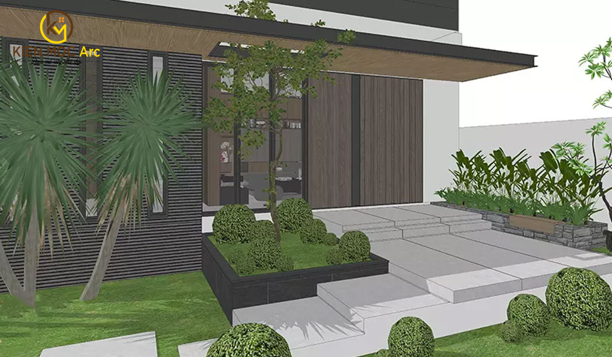 Mặt tiền của biệt thự cũng được bố trí nhiều cây xanh xung quanh giúp tăng sự thoáng mát, tươi mới cho không gian.