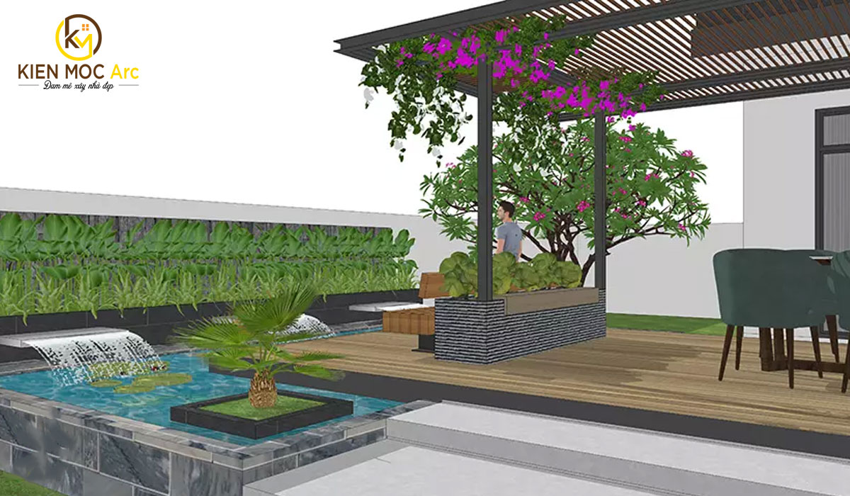 Một góc sân vườn biệt thự được thiết kế với bể nước tràn kết hợp với cây xanh để gia đình có thể tụ tập ăn uống, nghỉ ngơi và thư giãn,