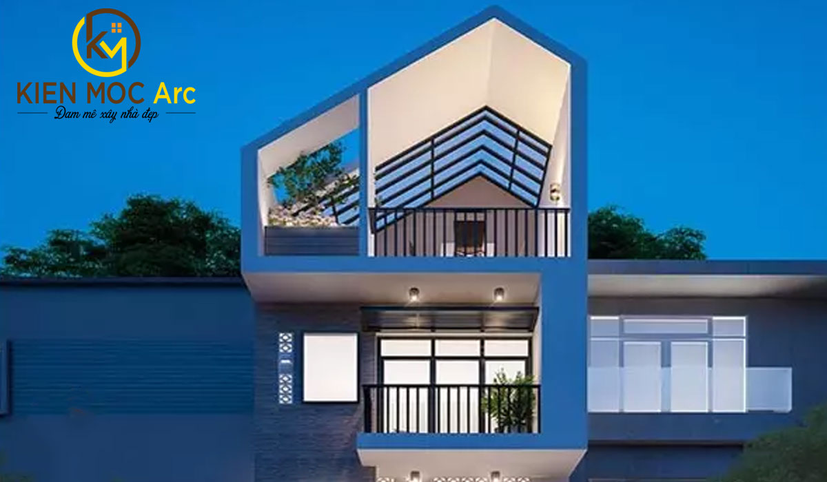 Mẫu thiết kế kiến trúc nhà phố được yêu thích thứ hai chính là kiểu nhà mái thái 3 tầng thượng phá cách. Trong đó mái nhà được thiết kế với những đường xẻ vô cùng độc đáo, mang phong cách hiện đại.